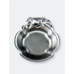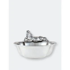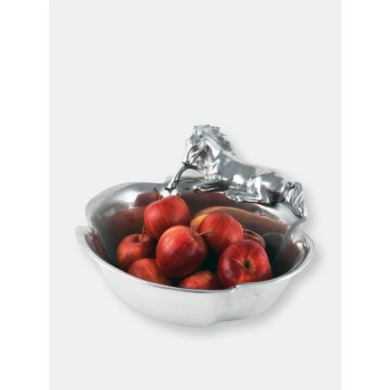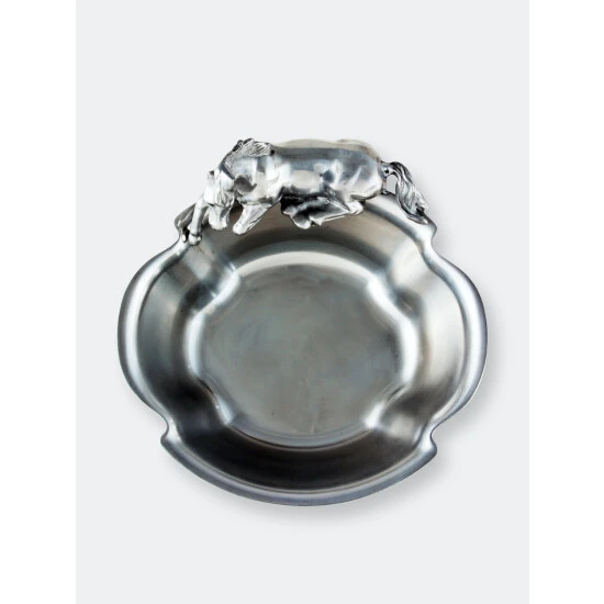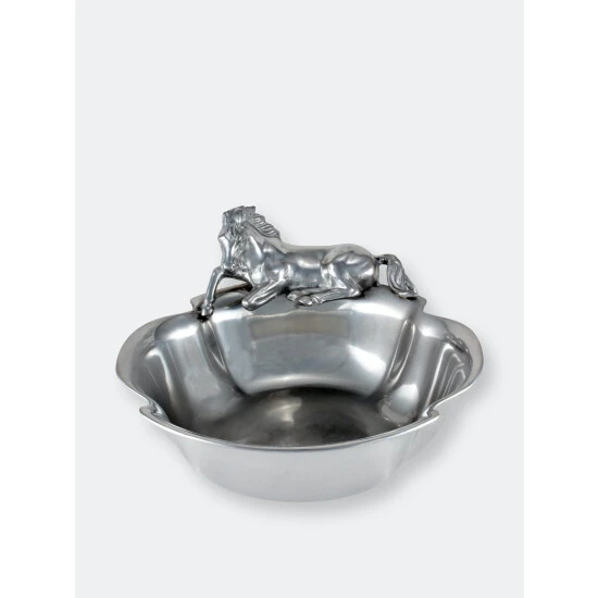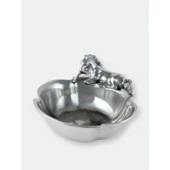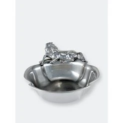 A beautifully detailed stallion sits along one edge of this piece as it waits patiently for the food to arrive. The horse’s friendly demeanor gives life to the design, while the slightly flared sides of this handmade, aluminum bowl make it easily transportable.