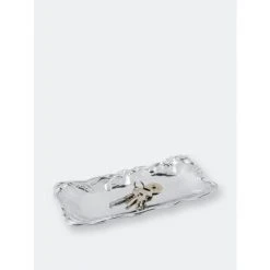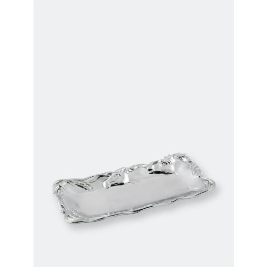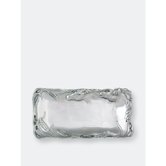 Jump on this luxurious and affordable 6×12 Horse Bread Tray from Arthur Court.Horses chase after the swishing stalks of wheat that line this piece, their pursed lips savoring the meal to come. Unbelievable detail marks each edge of this handmade, aluminum tray, highlighted by the horses’ manes and pieces of grain.