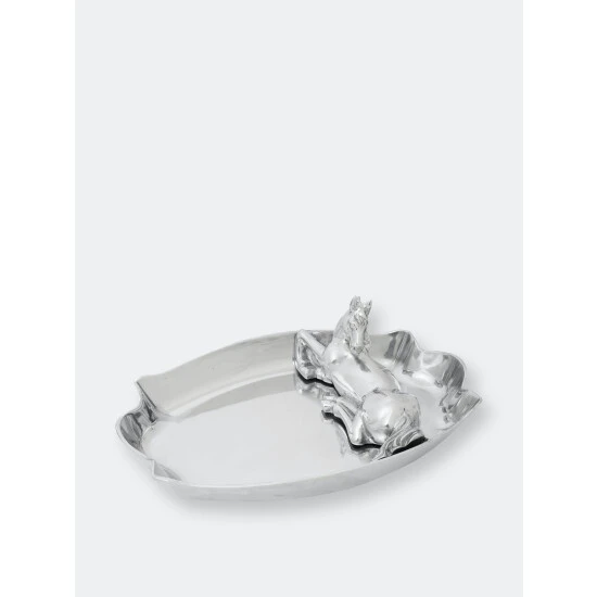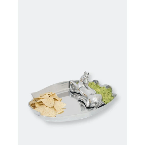 Form a beautiful barrier between your foods with this Horse Figural Chip and Dip from Arthur Court.Rippled ends enclose a horse inside this handmade, aluminum dish as it lounges in the middle of the action. The stallion’s muscular body and bushy tail add lifelike appeal to this dish.