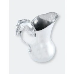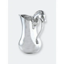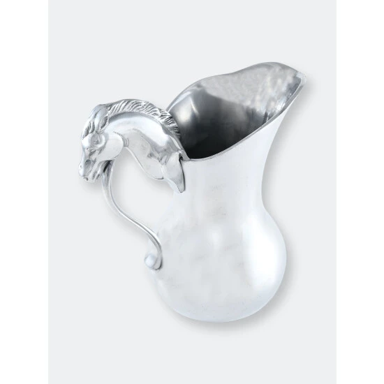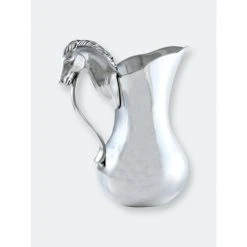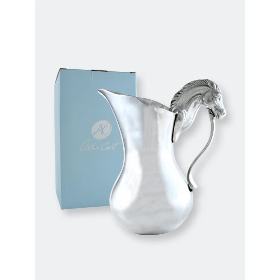 Turn your drinkware into a prominent fixture on the table by using this Horse Head Pitcher from Arthur Court.A brilliant horse head extends off the back rim of this piece and attaches to the handle underneath its muzzle. The creature’s mane displays incredible detail as it runs up its neck, while a bridle is visible around the statuette’s cheek bones. Handcrafted in lustrous aluminum, the pitcher features a wide, circular base and extended spout for easy pouring.