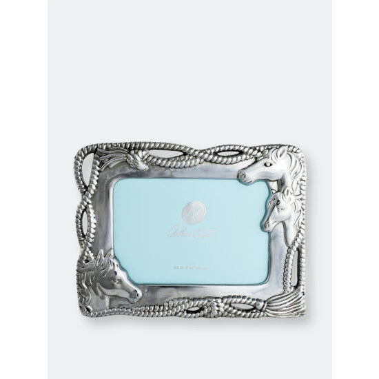 Show off your favorite photos in style when you place them in this 4 x 6-inch horse photo frame from Arthur Court. The horse heads placed asymmetrically at the top right and lower left corners of the frame provide a sense of balance, and the frayed ropes that intertwine around the frame’s openwork border convey the theme clearly to anyone who loves all things equestrian. This aluminum frame is easy to care for, with only simple dusting required, and it won’t tarnish over time. Use the gift box it comes in to give it as a present to any horse-loving friend, or display photos of your own favorite people and horses in it at your home or ranch. This shiny frame never needs polishing, and you can either set it on a credenza or bookshelf for display or hang it on the wall so everyone can enjoy it. Frayed ropes show remarkable detail as they intertwine to form the piece’s openwork border. Horse heads also adorn the upper-right and lower-left corners of this handmade, aluminum frame.