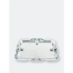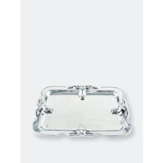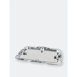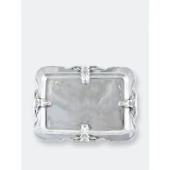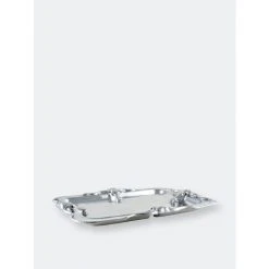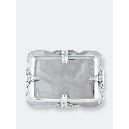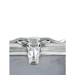 Take food from Arthur Court’s Large Longhorn Oval Platter quickly before these hungry animals get involved.All four of these lifelike steer heads point towards the middle of this piece as their muzzles extend into the interior from each side. Their unmistakable horns blend into the ropy pattern that borders the wavy, outer edge of this handmade, aluminum dish.