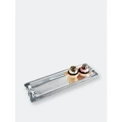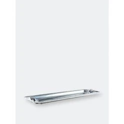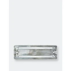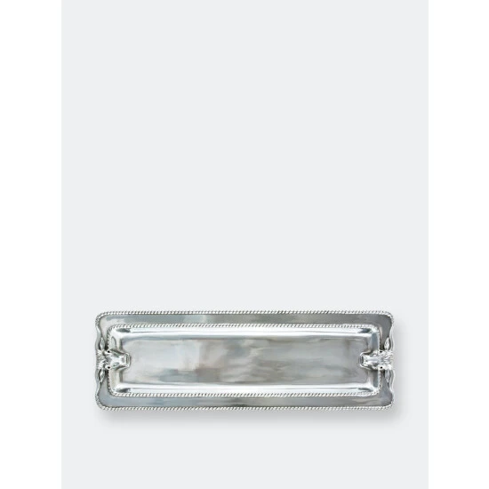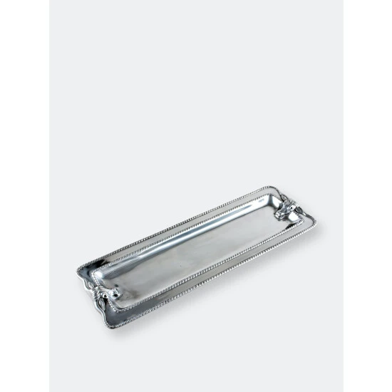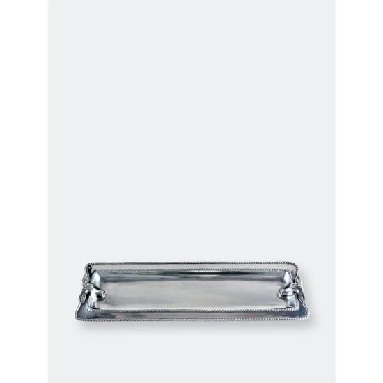 Spotlight your favorite dish by putting it in this 17-inch Longhorn with Braid Oblong Tray from Arthur Court.Detailed steer heads stare into the dark eyes of one another on opposite sides of this tray, while their muzzles stretch towards the middle. The animals’ horns blend into the double-sided, ropy pattern that borders the interior and exterior edges of this handmade, aluminum tray.