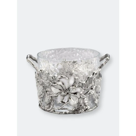 The mysterious magnolia is part of the fossil record from 20 million years ago, but the bright flower imprinted on this magnolia ice/wine bucket from Arthur Court is fresh as spring. You don’t have to be a southern belle to enjoy the elegant impression it leaves atop your bar or kitchen counter. Its crisp aluminum foliage envelops the magnolia centerpiece and branches upward into delicate handles to lend an upscale ambiance to your intimate get-together. Textured glass accentuates the organic metalwork and reflects the light off icy contents beautifully. This 9 x 6-inch Arthur Court magnolia ice /wine bucket is compact enough to stow away in cabinets and curios, and is lightweight for easy portability. The fragrant flower sometimes takes 10 years to bloom on young trees, but you can enjoy its ageless allure anytime with this intricate but durable barware. A brilliantly-defined magnolia stands out in the center of each side as foliage surrounds the flower as an accent. Handles branch off the leaves to form supportive handles, while the rippled glass reflects the handmade, aluminum design. Size: Diameter: 9.0″ / H: 6.0″