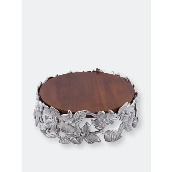 Feature an assortment of finger foods on this elegant Magnolia Wood Cheese Pedestal from Arthur Court.Gorgeous magnolias display incredible depth as they combine with leaves and vines to create the piece’s openwork base. The remarkable definition within each petal and vein highlights the craftsmanship of this handmade, aluminum design. A removable, acacia insert looks especially rich as it rests above the lustrous motif.