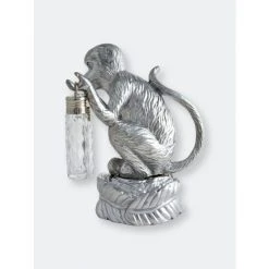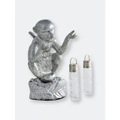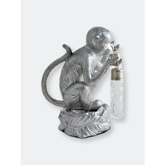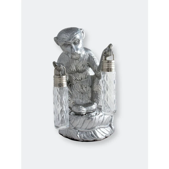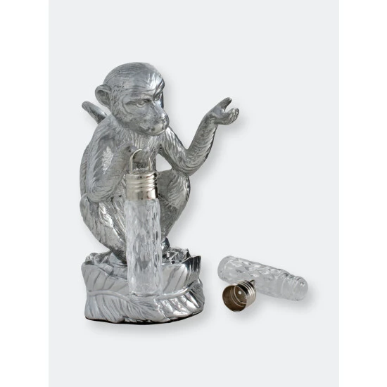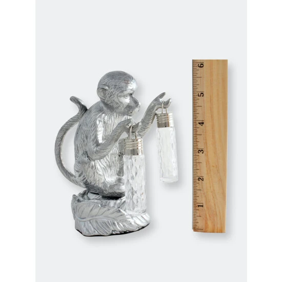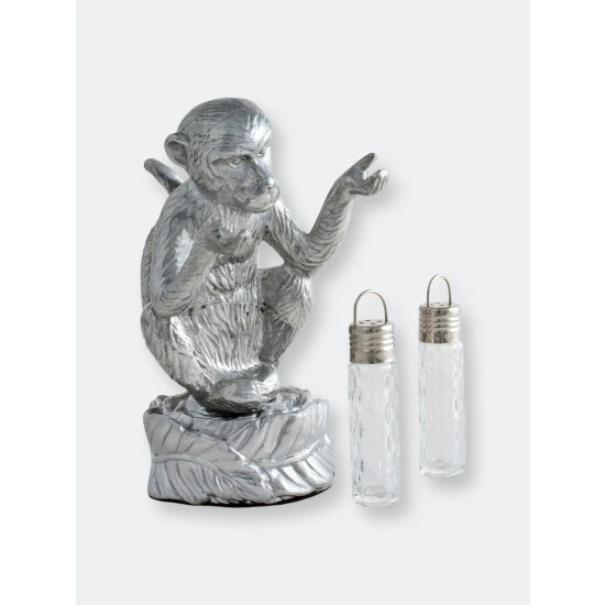Offer up the endearing display of Arthur Court’s Monkey Hanging Salt and Pepper Set to your family and friends.This wise monkey sits on a pedestal of leaves and extends the removable, glass dispensers in its hands. Handcrafted in sand-cast aluminum, this piece features incredible detail in the animal’s hairy body and realistic face.