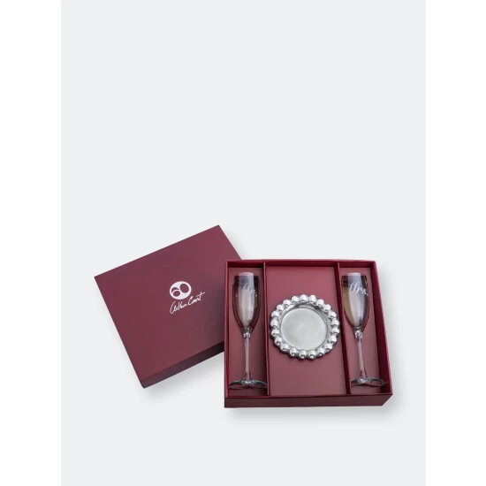 Kick off your marriage celebration in style with this Mr & Mrs Champagne Set from Arthur Court.The affectionate titles display in the center of each glass and reflect prominently against the bubbly liquid. The handmade, aluminum coaster also draws warranted attention with its beaded border.