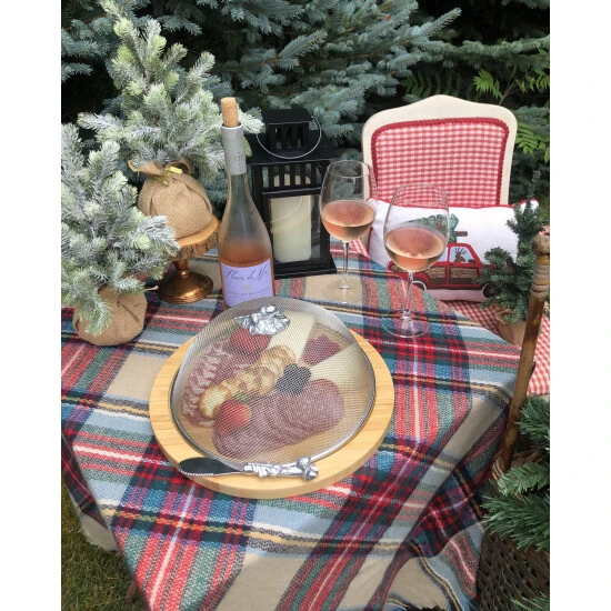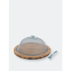 Sturdy and durable round Bamboo Cheese board with a deep channel on the outer side to fit the Arthur Court Picnic Cover, if needed. The board comes with an artfully handcrafted aluminum spreader and a stainless steel picnic cover with an elegant Oak Leaf knob.
