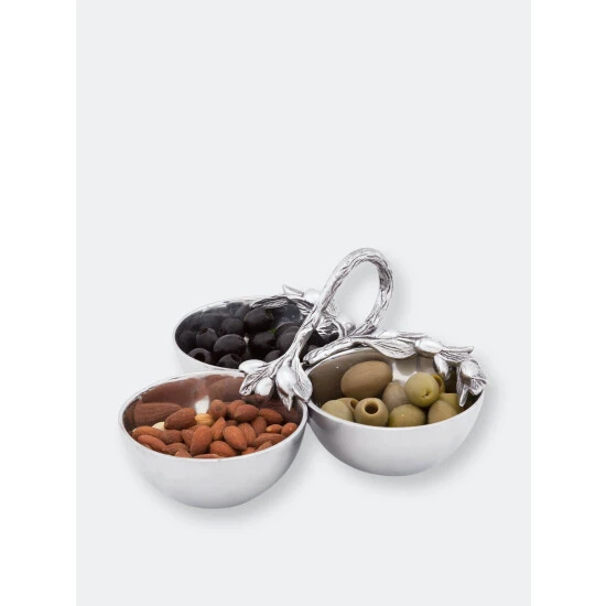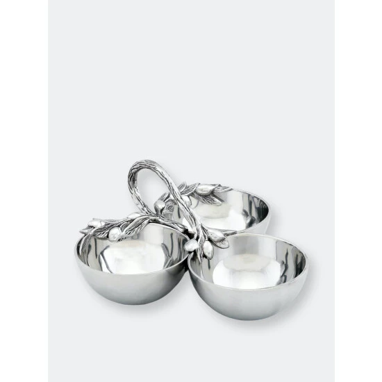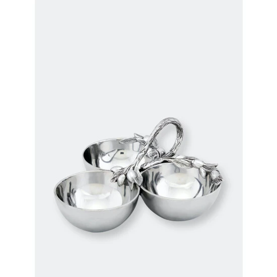 Three highly polished metal, Arthur Court Signature Sand-Cast Aluminum bowls join together, attached to a rustic looking olive branch, heavy with ripe fruit. Fill with an assortment of olives, nuts and candies or spreads and tapenades, place on a table and feel the warmth of Tuscany enter the room.Create a sun soaked Mediterranean feeling anywhere you serve from Arthur Court’s 3 Bowl Olive Condiment Server.