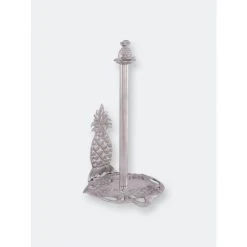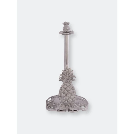 Create a tropical atmosphere in your kitchen with this Pineapple Paper Towel Holder from Arthur Court. Detailed leaves erupt from the crown of a large pineapple at the base of this piece, while suckers fan out underneath the fruit.A smaller pineapple sits atop the handmade, aluminum design, with both pieces showing incredible definition in their spiky, square-patterned shells.