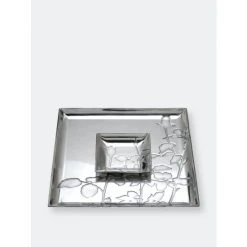 Shining planes of polished aluminum create a chip and dip tray from Arthur Court. Exquisitely artistic, the design features a reverse-relief casting impression that creates a silhouette of the rich roses. Arthur Court’s chip and dip trays are non-tarnishing and lustrously polished.