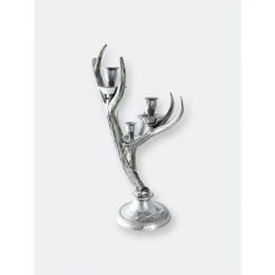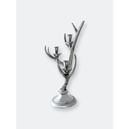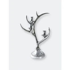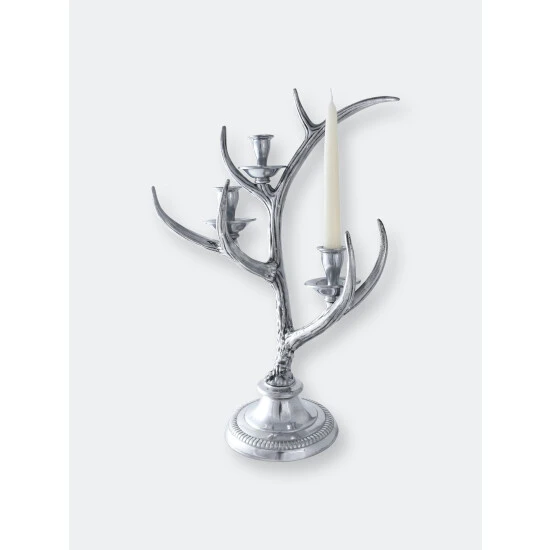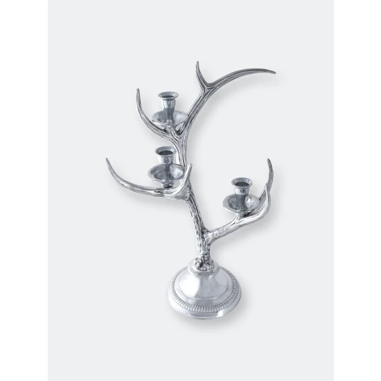 Bring a soft glow to rustic decor with this Arthur Court three-light metal candlestick holder. Graceful prongs curve away from the main branches of the antlers, with each joining supporting a small candle holder, ideally sized for taper candles. The sturdy structure of the candleholder, with the larger base and thick candle cups, ensures that even the tallest taper candles remain snugly in place while lit. The candlestick holder has a round base and is all one piece, crafted from Arthur Court’s signature sand-cast aluminum. The shine of the metal and delicate craftsmanship elevate this eye-catching piece from simple rustic to sophistication. The candlestick holder has a sturdy base, and snugly holds most standard taper candles. The shiny aluminum metal gleams and is specifically blended to be tarnish-resistant. To clean wax off the candle holder, simply use very hot water and a soft cloth to gently wipe it away. You may also choose to buff your candlestick holder with a soft chamois cloth.This design features antlers emerging up from a circular base as they balance on their burr. Multiple forks branch off the main stem, while the candle holders take the place of other points. The realistic definiton within the antlers stands out against the lustrous holders and stand.