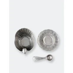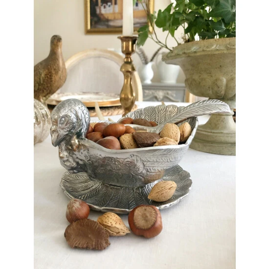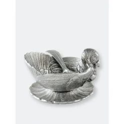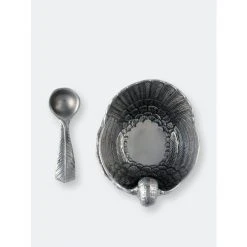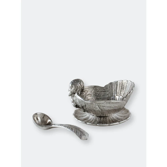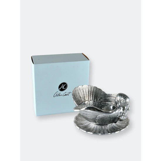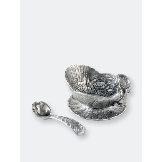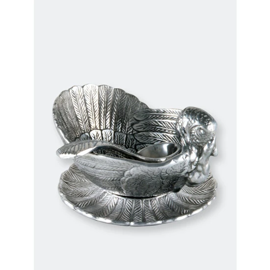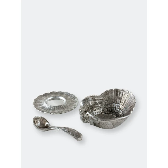 Pour a large, Thanksgiving helping of cranberry relish inside this 3-Piece Turkey Condiment Set from Arthur Court.Intricate feathers display on the outside circle of the dish, the spoon’s handle and throughout the bowl’s design, save for a small circle in the center. The expert craftsmanship of this handmade, aluminum set really stands out when the pieces are fitted together.