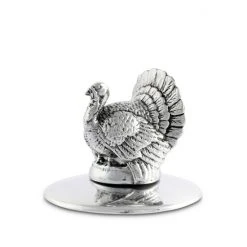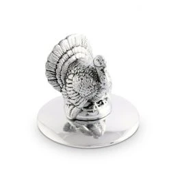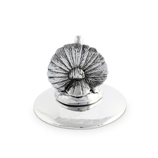 A detailed aluminum turkey at rest provides finial / handle for this lovely, hand-crafted nature theme napkin weight. Anchored by a aluminum disk to provide ample cover and weight to keep a stack of napkins orderly even when enjoying a breezy al fresco gathering.